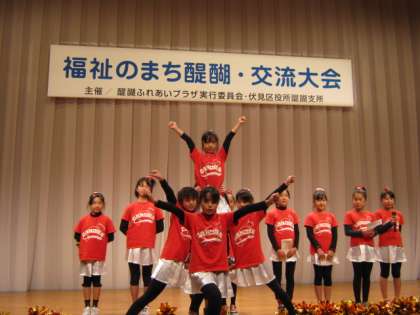 1月28日の土曜日に,福祉のまち醍醐・交流大会で,チア部の演技を発表しました。はじめに,「ベア」などスタンツの説明をしました。