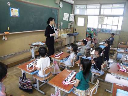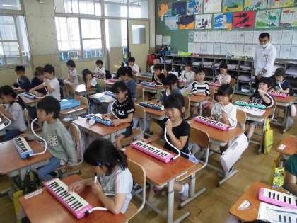 鍵盤ハーモニカの学習を始めました。鍵盤の用意をしていると突然、1年1組にお手紙が届きました!教頭先生の手にしているお手紙には、宇宙の柄の切手が貼られ、封筒もドロドロに汚れている状態で、子どもたちは興味津々。中を開いてみると「けんばんハーモニカ君」からの手紙でした。大事に鍵盤を使ってもらうためのお願いが5つ書かれていました。子どもたちは、大事に使おうという意欲を高めていました。