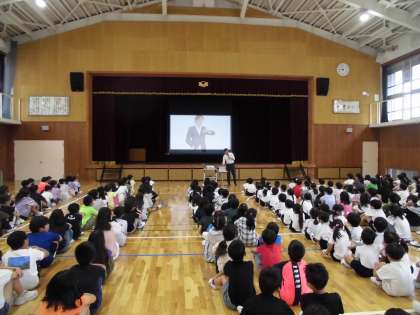 1年生にとって2回目の朝会です。たくさんの上級生にかこまれて緊張していましたが、校長先生のお話にたくさん反応して聞き入っていました。