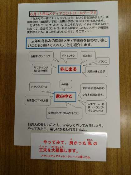 6月15日の下校後から翌朝の登校までチャレンジしてから登校します。家でアウトメディアチャレンジシート右半分に結果を記入して,19日月曜日に学校に持たせてください。