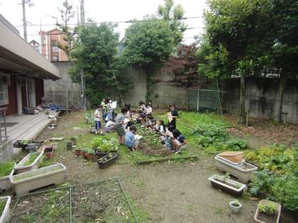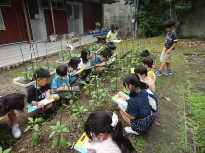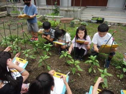 植えたピーマンの観察をしました。つぼみの数・苗の高さに注目している子が多かったです。においや手触りについて観察している子もいました。