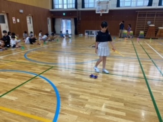 参観日に作ったゴムカーを使って、ゴムの伸ばす長さによって進む距離が違うのか調べました。