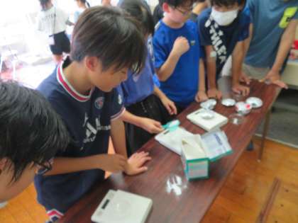 水の量と洗剤の量を量り、靴下をもみ洗いやつまみ洗いをして、洗濯しました。水がだんだん濁ってきて、しっかり洗えているという実感をもてたようです。また、量った洗剤の量が思った量より少ないことに対して、洗剤は入れたら入れただけ汚れが落ちるのではなく、決まった量を入れることが大切であることが分かったようです。