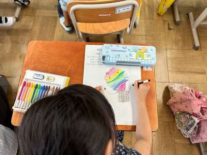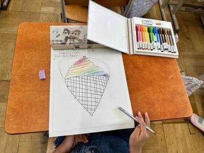 図画工作で1つのお話から想像を広げて、絵を描いていきます。お話の名前は『マッテオじいさんのふしぎなジェラート』という物語です。お話の中に出てくるジェラートはおまじないをすると長〜く伸びるものですが、みんななら、どんなジェラートが食べたいか想像を広げていきました。カラフルなジェラートや食べても減らないジェラート、おしゃべりできるジェラートなど、面白いジェラートがたくさん生まれていました。