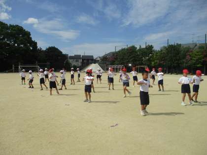 運動会の団体演技の練習を1年生としました。1時間目は運動場で踊りました。2時間目は、とても暑くなってきたので多目的室で練習しました。楽しい音楽にあわせて踊ります。本番を楽しみにしてください。