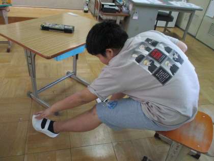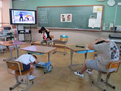 身体計測と眼科検診の前に、保健室の先生と一緒に、視力を守る学習をしました。長くメディア機器を見てしまった後は遠くを見つめて瞬きをすることや、座ったままできる簡単な体操を教えてもらいました。