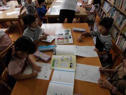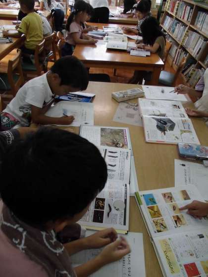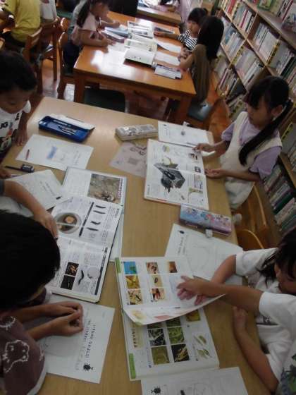 いきものと仲良くなるために、いきもののお家づくりやえさのやり方などを調べました。それぞれのいきものの図鑑を使って、虫かごの中にどんなお家を作っていけばよいか調べ、絵にまとめていきました。