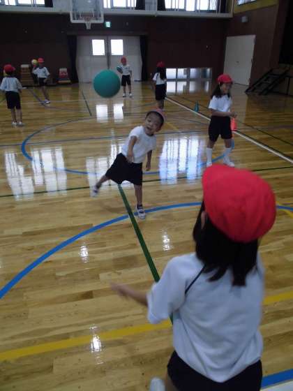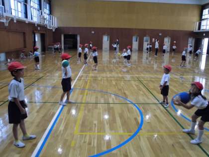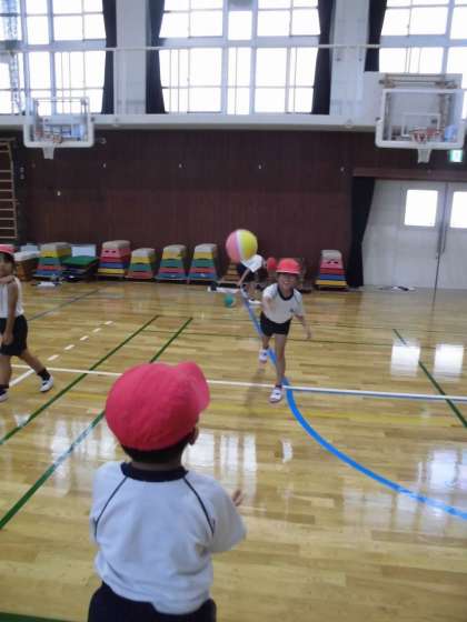 ボール遊びが、どんどん発展していっています。「ひとりあそび」から「ふたりあそび」へ。二人ペアでのパスも、両手なげから片手なげへと発展していきました。最初はなかなか片手で投げられなかった子どもたちも、何度も繰り返しているうちに、徐々に手の上にのせて、片手のまま上手にボールを投げられるようになってきました。