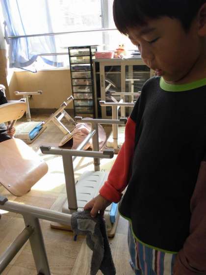 今日は、栗陵中学校区4校でクリーン活動を行うエコふぁみりぃの日です。1年生の子どもたちは、いつもはなかなか手の届かない机や椅子の脚の裏の掃除を行いました。毎日、使っているけど、なかなかじっくり掃除を行えない机や椅子の脚が、きれいになりとても嬉しそうでした。