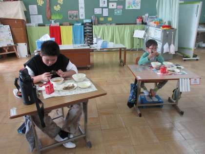 今日の給食は、肉みそ納豆とご飯を手巻きのりで巻いて食べました。「説明なくてももう知っているよ」と巻き方のお手本を見せてくれたり、「自分で頑張ってやってみるよ」とのりにご飯とおかずを丁寧にのせて見せてくれたりしました。