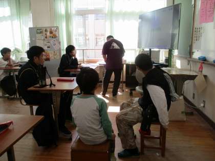 今日は栗陵中学校の育成学級さんとの交流会でした。校長先生と一緒に歩いて、栗陵中学校に向かいました。校門のところには中学生のお兄さんたちが待っていてくれていて、みんな緊張したようすで教室に向かいました。