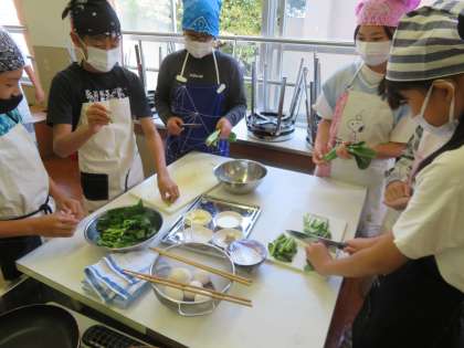 調理実習で、スクランブルエッグと小松菜の油いためを調理しました。