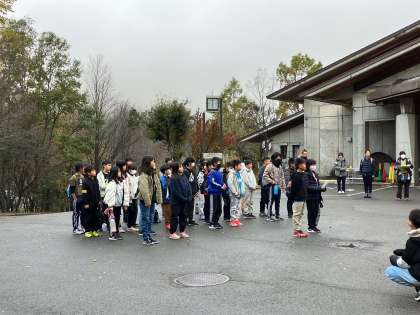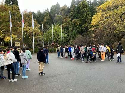 山の家2日目が始まります。朝の集いは一緒になった学校と一緒に、学校紹介をしました。