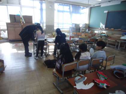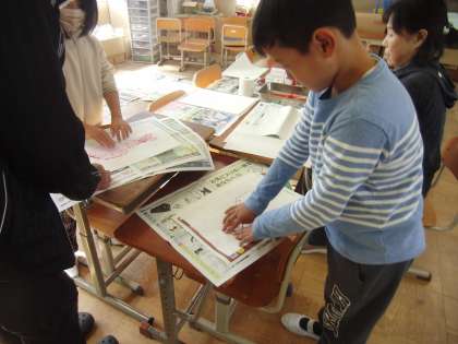 魚の紙版画に赤いインクをつけて、赤い魚たちがたくさんできました。同じ形の魚だけど、少しずつちがってとてもかわいい魚たちができました。