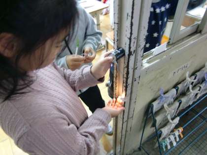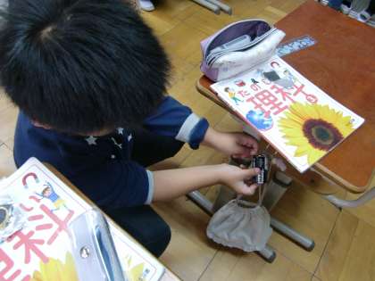 「ついた!」「ここもつくかな?」「どうするの?」「ちょっと乾電池もっててくれる?」回路づくりに苦労している姿もありました。つくはずなのにつかない!とやり直す姿もありました。ちゃんと回路ができていなかったことに気付く子どもたち。それが学習。便利な装置を使う前にいろいろ経験してもらいました。何度も言いますが、明かりがついたということは電気が通ったということ。日ごろからお世話になっている明かりを自分でつけることができた喜びを、感じてくれたことと思います。かわいい明かりがつきました!