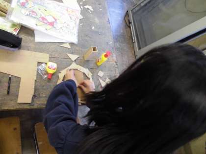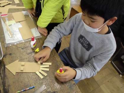 のこぎりで木を切り出した後は、木どうしをボンドでくっつけ、形を作っていきます。動物や乗り物をイメージしながら、試行錯誤しながら木を動かし作り進めていました。