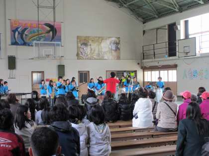 栗陵中学の体育館でわれらエコファミリーのステージ発表がありました。池田東小学校からはスィングキッズが出演しました。