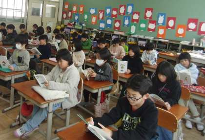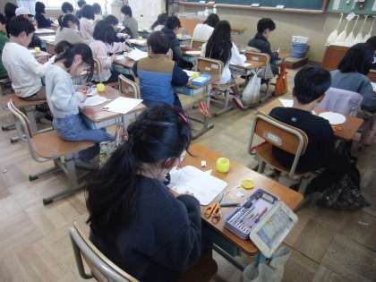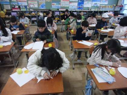 画用紙を使って、鬼の顔を作りました。一つ一つ画用紙で作り、鬼の顔に貼っていきました。教室がかわいい鬼・こわい鬼でいっぱいになりました。
