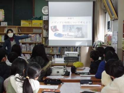2月にあるメディアコントロールデーに向けて、今日は身体計測の前に保健室の先生からメディアと時間の使い方についてのお話しを聞きました。メディア機器はとても楽しいものですが、時間を決めずに使っていると、決まった時間に眠れず朝起きられなかったり、授業に集中できなかったりと心と体に影響してしまうことが分かりました。