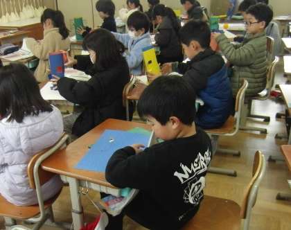 カッターナイフを使って建物の窓を作り、町を作っています。一人ひとり違う町ができていて、楽しそうでした。