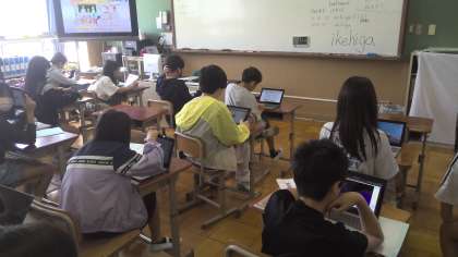 1人1台のタブレットを使って英語の正しい発音や歌を確認しました。