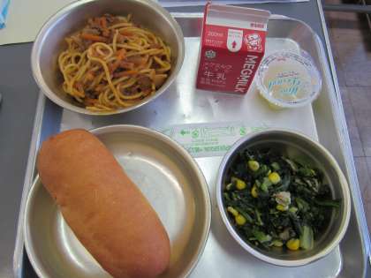 今日の献立は ミートスパゲッティーと ほうれん草のソティー。