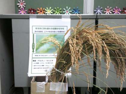 秋らしい天気が感じられるようになってきました。地域の方から稲穂をいただきました。やっと少し過ごしやすくなったこの頃です。10月の朝会は、元気な子どもたちの校歌でスタートしました。明日から5年生が花背山の家宿泊学習に出発するため1日早い全校朝会でした。昨日、本校学区の防災訓練が実施されたこともあり今日は校長先生より防災についてお話いただきました。