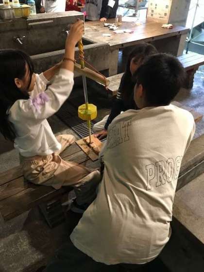 その後、火おこしに挑戦しました。協力して、どのグループも火をおこすことができました。この後、この火を使って、野外炊事をします。大事な火です。