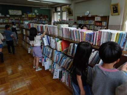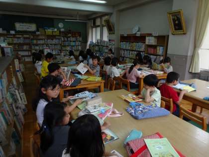図書館へ行きました。朝読書の時間に夢中になって読める本探しです。早く借りられたら静かに読書タイムです。