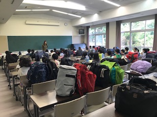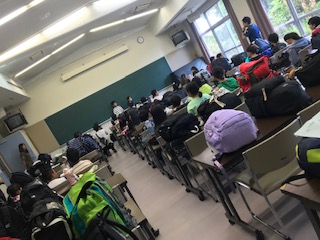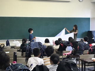 暑いため、館内で入所式をしました。所員の方に元気にあいさつをして、シーツの使い方やたたみ方を教えていただきました。