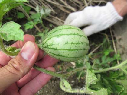 放課後に雑草を抜いていると、踏んでしまいそうな位の赤ちゃんスイカ発見!!