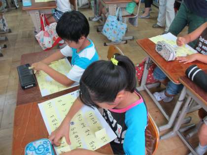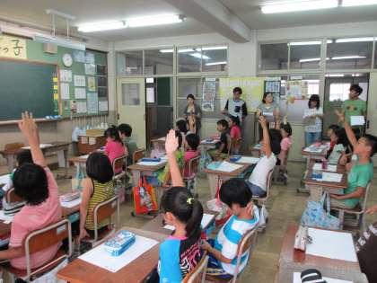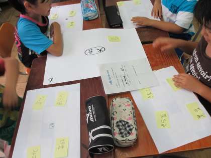 今日の5校時に3年2組は,総合的な学習の時間で「もりもり大豆はかせになろう」という勉強をしました。まず一人ひとりが作ったイメージマップから四つの言葉を選び,グループで交流しました。次に,話し合いながらウェビングマップを作っていきました。