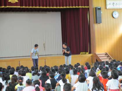 1校時の前半は朝会がありました。最初に校長先生から話があり,次に生徒指導部からコントをまじえながら「8・9月の目標」の話がありました。