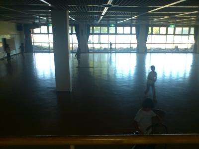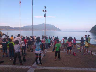 朝の集いと掃除です。集いでは,学校紹介・校歌紹介・ラジオ体操をしました。掃除は,自分たちの部屋だけでなく,一昨日のレクレーションで使ったプレイホールも綺麗にします。