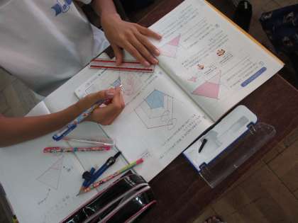 5校時,1組は算数でした。図形の拡大と縮小を学習しています。2倍の拡大図や二分の一の縮図をかいています。