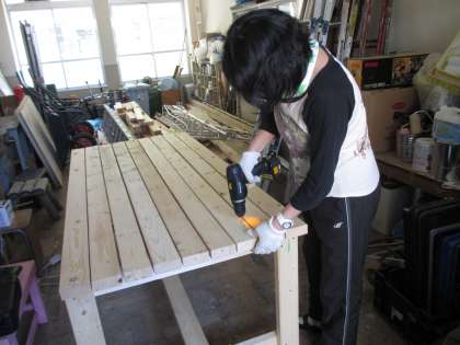 藤棚の下にある机の天板部分が,一部腐食していましたので,新しく作って設置しました。