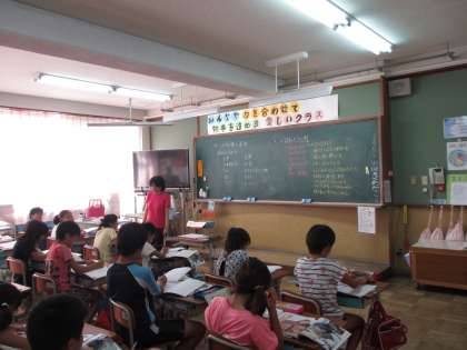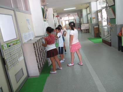 3校時に4年1組は算数の授業で1平方メートルの広さの勉強をしていました。1平方メートルの大きさの新聞紙をもって,同じ広さを探しました。2組は理科で体のつくりを学習していました。