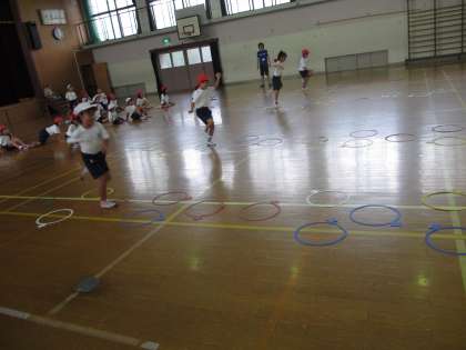 2年生は,3校時体育館で体育をしました。ケンケンパーで跳びました。みんな上手に跳べていました。