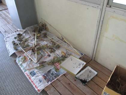 廊下には,畑から刈り取ったひまわりが置いてあります。