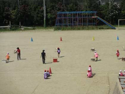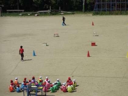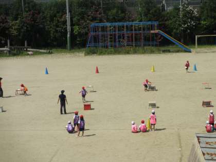 1年生は3校時に体育で折り返しリレーをしました。山本先生が手本を見せてから,各グループで走りました。