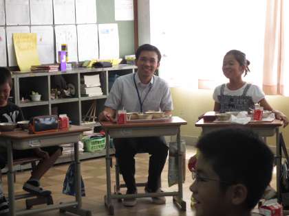 今日リー先生は,4年2組で給食を食べました。4年2組の子どもたちは,英語での挨拶や自己紹介を図書室で調べて,チャレンジしていました。