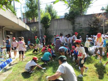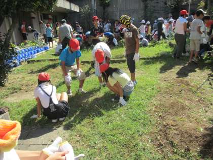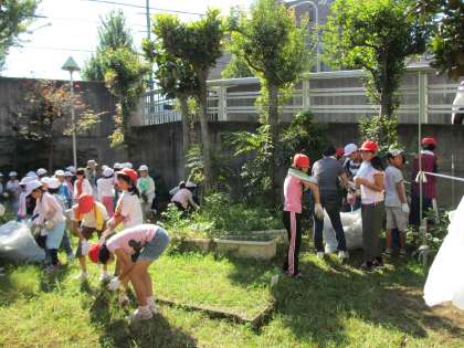 2年生と6年生は体育館横の畑の草引きをしました。10袋ぐらいの草をぬくことができました。