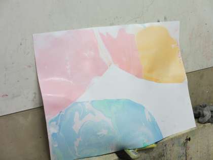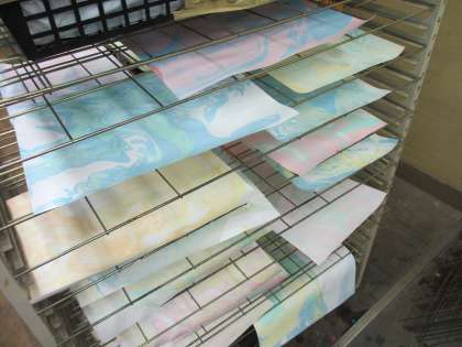 今日は,マーブリングをしました。八つ切りの画用紙と四つ切の画用紙と2種類しました。