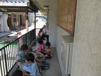 地域の方や女性会の方と育てている菊の観察をしました。だいぶん大きくなりましたが,でももっともっと大きく育てないといけないようです。