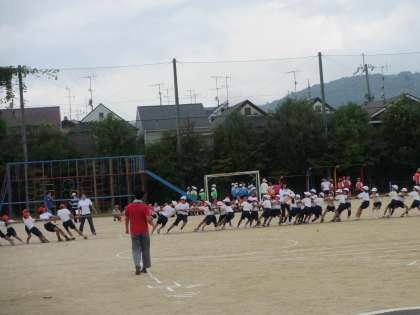 綱引きの練習では,1回戦は赤が勝ちました。場所を移動しての2回戦も赤が勝ちました。本番ではどうでしょう?