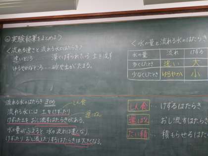 5年1組は1・2時間目は理科室で理科の学習をしました。「流れる水のはたらき」で実験をして結果をまとめました。