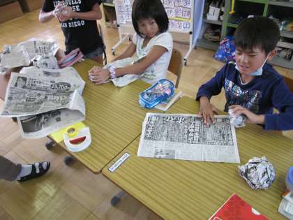 新聞紙を丸めて、キラキラの折り紙を貼りました。