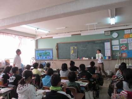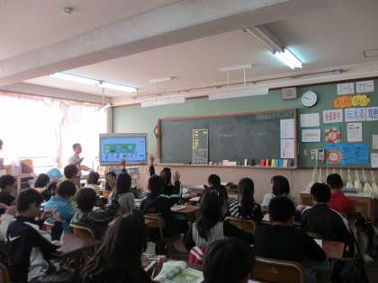 今日は,ALTのリー・ラモン先生の来られる日です。2時間目は,5年2組で授業がありました。色と形の言い方を勉強する時間で,クイズに答えたりゲームをしたりしながら,「レッド」や「サークル」などの英語を覚えていきました。