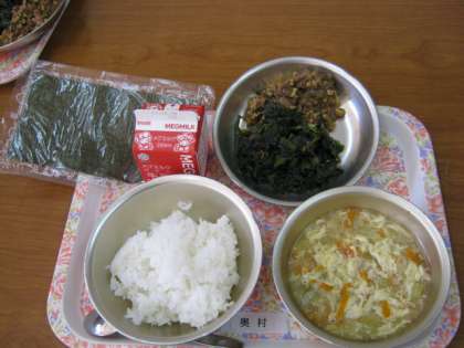 今日の給食は「ごはん・牛乳・肉みそ納豆・ほうれん草のおかか煮・キャベツの吉野汁」です。納豆が給食に出るのは,今年で2年目です。