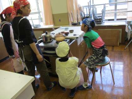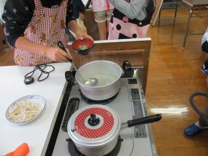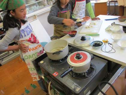 5時間目、調理実習をしました。お鍋でご飯を炊き,味噌汁を作りました。ほかほかで美味しそうなご飯が炊きあがっていました。
